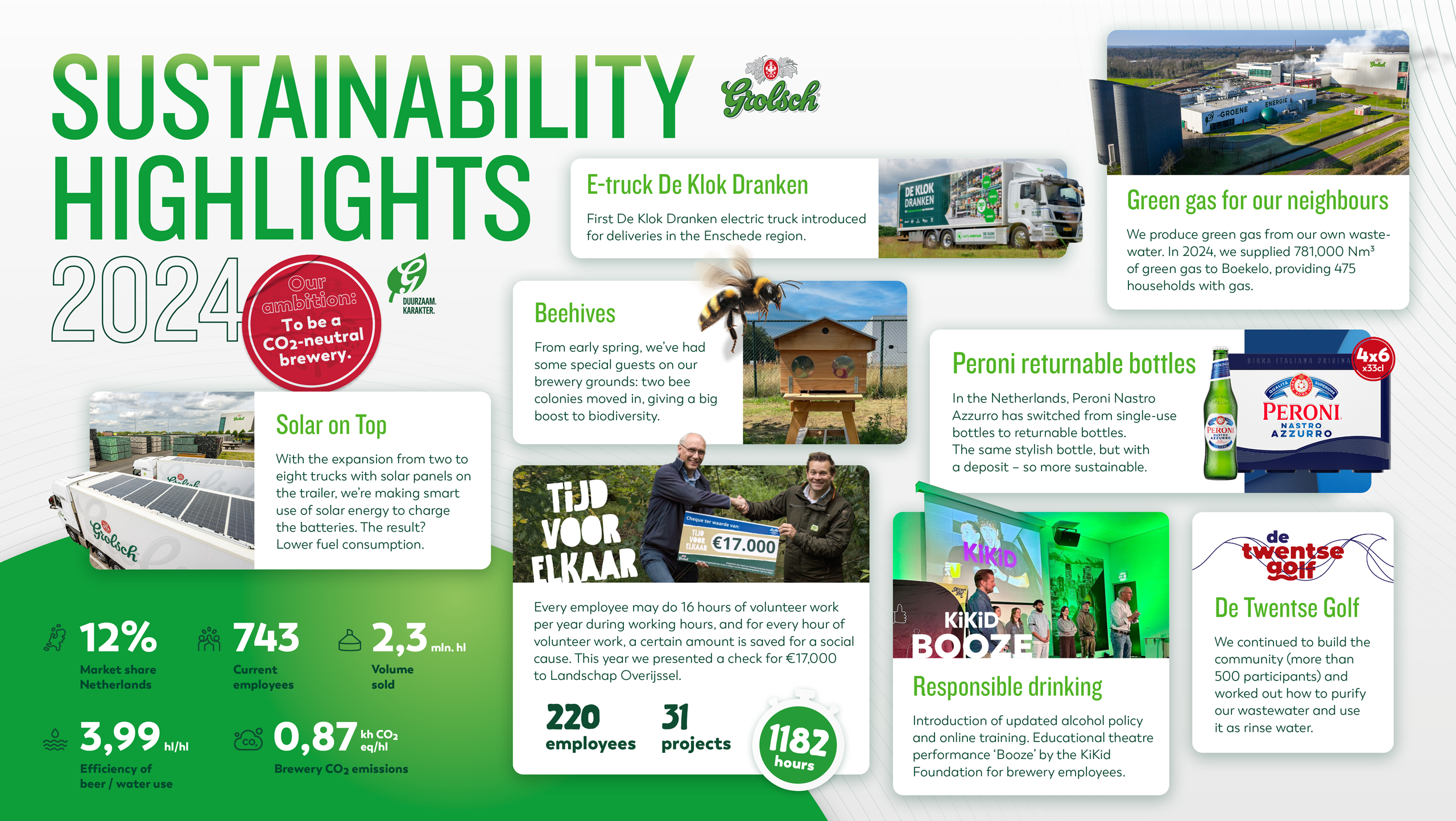Ook in 2024 heeft Koninklijke Grolsch weer mooie stappen gezet op het gebied van duurzaam en verantwoord ondernemen. Dit is te lezen in de duurzame highlights over 2024, die de brouwer vandaag publiceert. Naast projecten op het gebied van verpakkingen, CO2 en water zet de bierbrouwer ook in op maatschappelijke aspecten zoals vrijwilligerswerk en verantwoord alcoholgebruik.